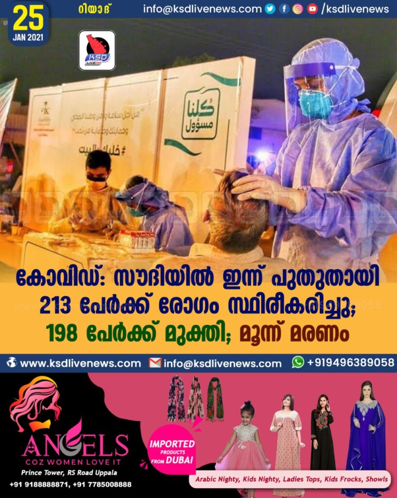 കോവിഡ്: സൗദിയിൽ ഇന്ന് പുതുതായി 213 പേർക്ക് രോഗം സ്ഥിരീകരിച്ചു; 198 പേർക്ക് മുക്തി ; മൂന്ന് മരണം