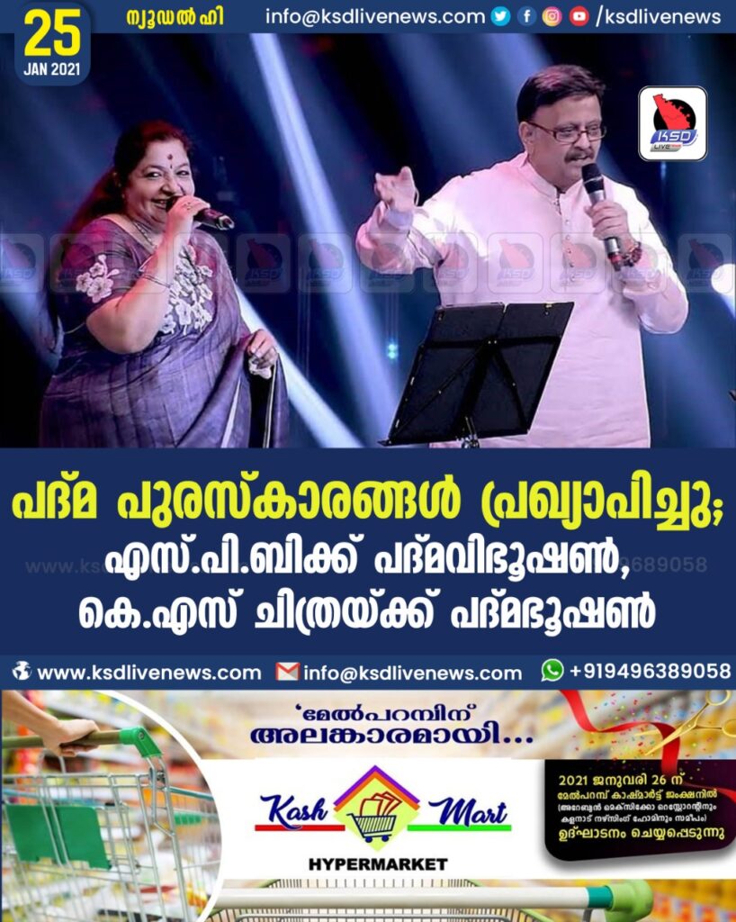 പദ്മ പുരസ്‌കാരങ്ങള്‍ പ്രഖ്യാപിച്ചു; എസ്.പി.ബിക്ക് പദ്മവിഭൂഷണ്‍, കെ.എസ് ചിത്രയ്ക്ക് പദ്മഭൂഷണ്‍