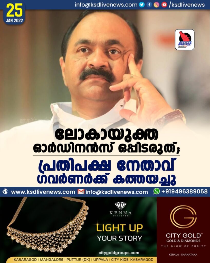 ലോകായുക്ത ഓര്‍ഡിനന്‍സ് ഒപ്പിടരുത്; പ്രതിപക്ഷ നേതാവ് ഗവര്‍ണര്‍ക്ക് കത്തയച്ചു