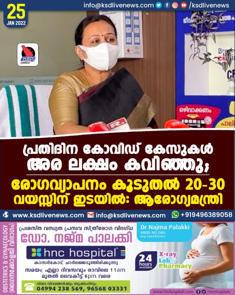 തിരുവനന്തപുരം: സംസ്ഥാനത്ത് കോവിഡ് തീവ്രവ്യാപനം തുടരുകയാണെന്ന് ആരോഗ്യ മന്ത്രി വീണാ ജോർജ്ജ്. പ്രതിദിന കോവിഡ് കേസുകൾ അര ലക്ഷം കവിഞ്ഞുവെന്നും ആശുപത്രിയിൽ പ്രവേശിപ്പിക്കുന്നവരുടെ എണ്ണം കുറവാണെന്നും വീണ ജോർജ്ജ് വ്യക്തമാക്കി.