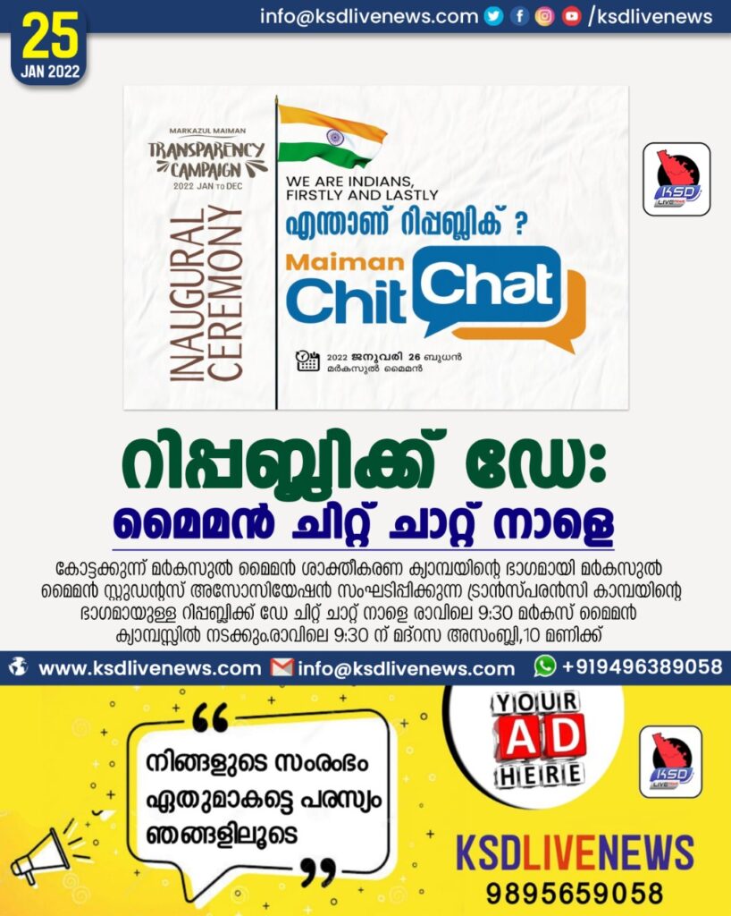 മൊഗ്രാൽ പുത്തൂർ :കോട്ടക്കുന്ന് മർകസുൽ മൈമൻ ശാക്തീകരണ ക്യാമ്പയിന്റെ ഭാഗമായി മർകസുൽ മൈമൻ സ്റ്റുഡന്റസ് അസോസിയേഷൻ സംഘടിപ്പിക്കുന്ന ട്രാൻസ്പരൻസി കാമ്പയിന്റെ ഭാഗമായുള്ള റിപ്പബ്ലിക്ക് ഡേ ചിറ്റ് ചാറ്റ് നാളെ രാവിലെ 9:30 മർകസ് മൈമൻ ക്യാമ്പസ്സിൽ നടക്കും.രാവിലെ 9:30 ന് മദ്‌റസ അസംബ്ലി,10 മണിക്ക് മൈമൻ ചിറ്റ് ചാറ്റ്.