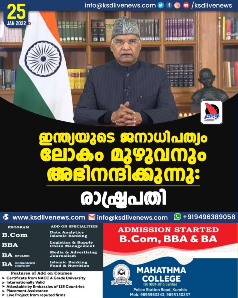ഇന്ത്യയുടെ ജനാധിപത്യം ലോകം മുഴുവനും അഭിനന്ദിക്കുന്നു: രാഷ്ട്രപതി