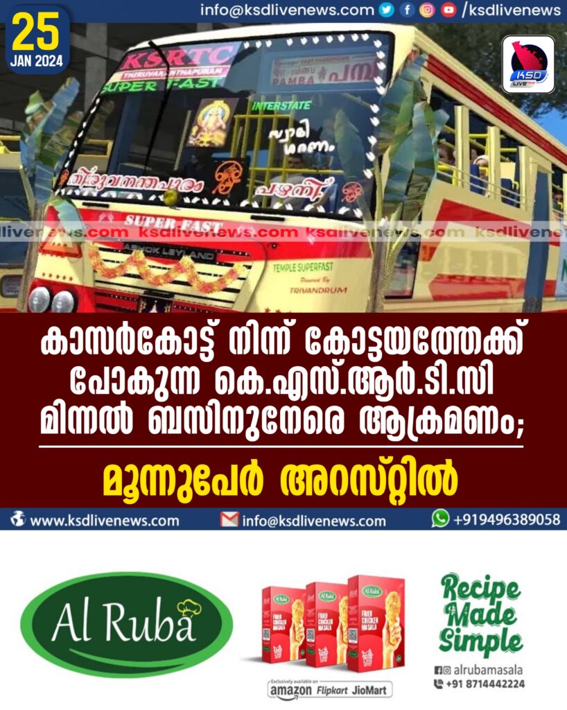കാസർകോട്ട് നിന്ന് കോട്ടയത്തേക്ക് പോകുന്ന  കെ.എസ്.ആർ.ടി.സി മിന്നൽ ബസിനുനേരെ ആക്രമണം; മൂന്നുപേർ അറസ്റ്റിൽ