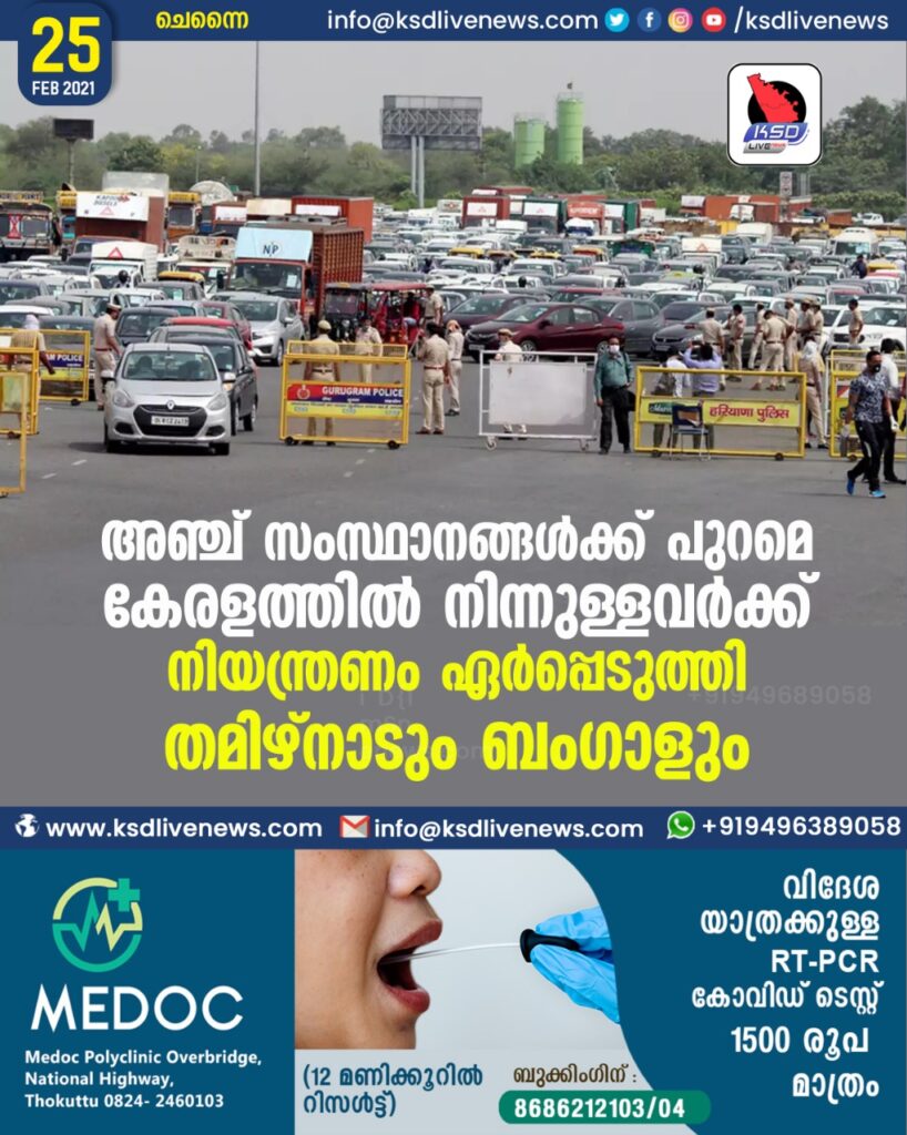 അഞ്ച് സംസ്ഥാനങ്ങൾക്ക് പുറമെ കേരളത്തില് നിന്നുള്ളവര്ക്ക് നിയന്ത്രണം ഏര്പ്പെടുത്തി തമിഴ്നാടും ബംഗാളും