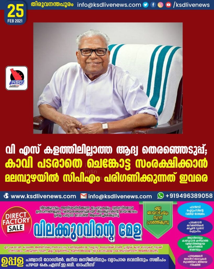 തു ടര്ഭരണം ലക്ഷ്യമിട്ട് പിണറായി വിജയന് വീണ്ടുമിറങ്ങുമ്ബോള് ഇടതുമുന്നണിയെ പല തെരഞ്ഞെടുപ്പുകളിലും വിജയപ്പടവുകള് കയറ്റിയ വി എസ് അച്യുതാനന്ദന് പോരാട്ട ഭൂമിയ്ക്ക് പുറത്താണ്. വി എസ് അച്യുതാനന്ദന് സജീവ രാഷ്ട്രീയത്തിലില്ലാത്ത ആദ്യ നിയമസഭ തെരഞ്ഞെടുപ്പാണ് നടക്കാന് പോകുന്നത്. പ്രായാധിക്യത്തെ തുടര്ന്ന് വി എസ് വിശ്രമ ജീവിതത്തിലേക്ക് കടക്കുമ്ബോള്, മാരാരിക്കുളം തോല്വിയ്ക്ക് ശേഷം അദ്ദേഹത്തിന് രണ്ടാം വരവ് സാധ്യമാക്കിക്കൊടുത്ത മലമ്ബുഴയും ചര്ച്ചയില് നിറയുകയാണ്. സിപിഎമ്മുകാരെ മാത്രം വിജയിപ്പിച്ചുവിട്ട ചരിത്രമുള്ള, കാവി പടര്ന്നുകൊണ്ടിരിക്കുന്ന ചുവന്ന കോട്ടയില് മുന് മുഖ്യമന്ത്രിക്ക് പകരമാര്
