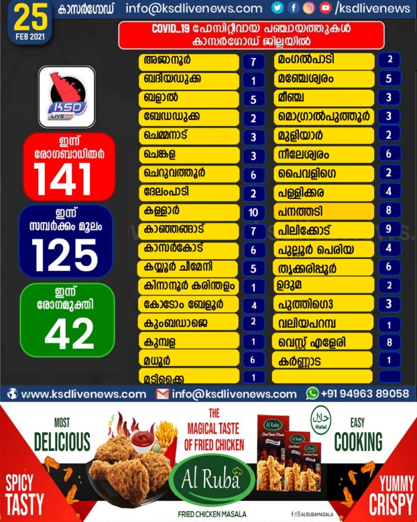 കാസർഗോഡ് ജില്ലയിൽ ഇന്ന് കോവിഡ് സ്ഥിരീകരിച്ചവരുടെ പഞ്ചായത്ത് തിരിച്ചുള്ള സ്ഥിതി വിവര കണക്ക്