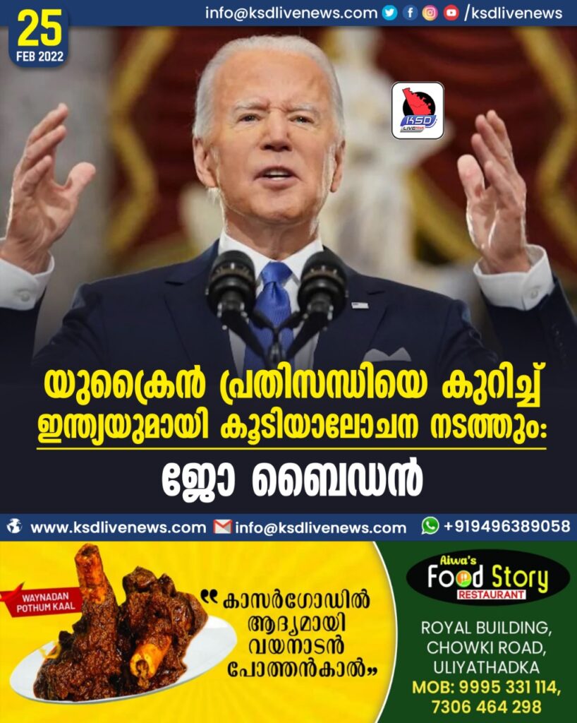 യുക്രൈന് പ്രതിസന്ധിയെ കുറിച്ച് അമേരിക്ക ഇന്ത്യയുമായി കൂടിയാലോചന നടത്തുമെന്ന് അമേരിക്കന് പ്രസിഡന്റ് ജോ ബൈഡന്.