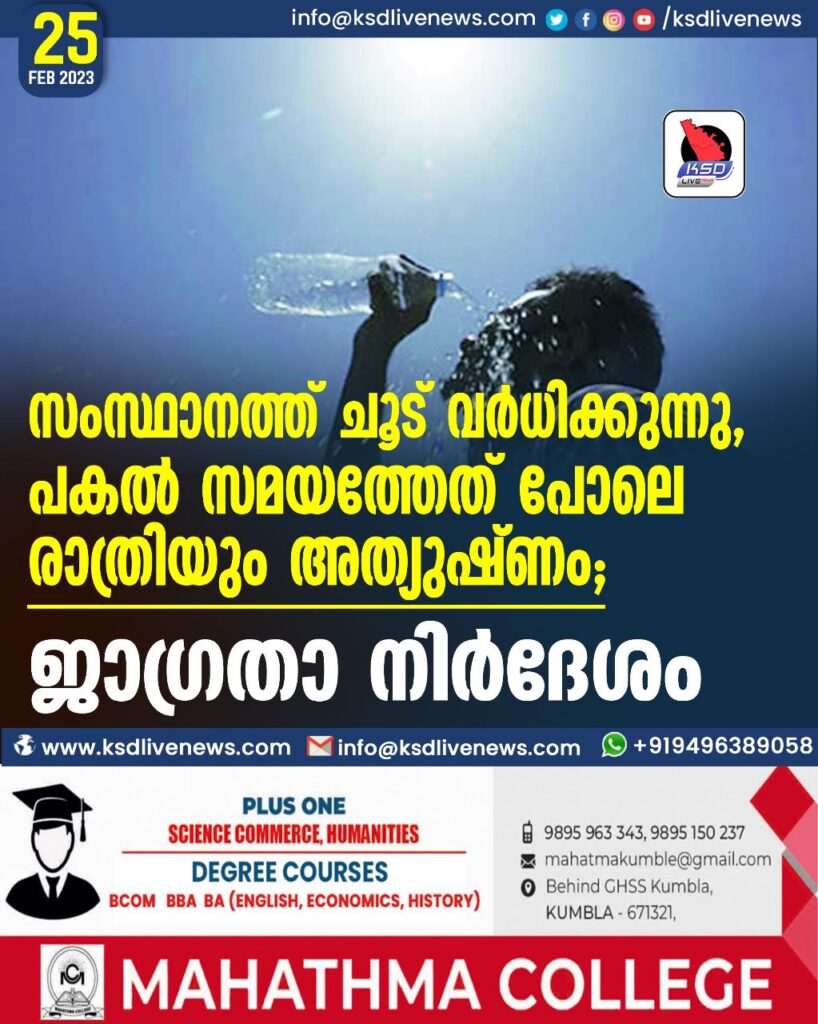 സംസ്ഥാനത്ത് ചൂട് വർധിക്കുന്നു, പകൽ സമയത്തേത് പോലെ രാത്രിയും അത്യുഷ്ണം; ജാഗ്രതാ നിർദേശം