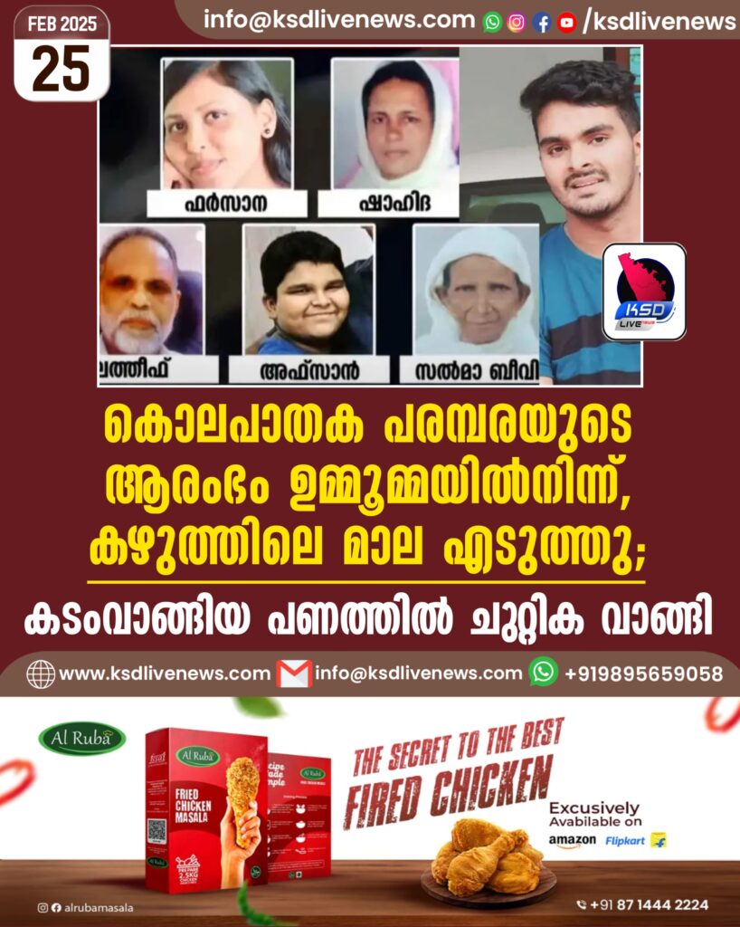 ശേഷം വീട്ടിലേക്ക് തിരിച്ചെത്തി ഉമ്മയെ ആക്രമിച്ചു. പെൺസുഹൃത്തിനെ വീട്ടിലേക്ക് വിളിച്ചു വരുത്തി കൊലപ്പെടുത്തി. ശേഷം പുറത്ത് കളിച്ചു കൊണ്ടിരുന്ന സഹോദരനേയും കൊലപ്പെടുത്തുന്നു. എല്ലാം കഴിഞ്ഞ ശേഷം ഓട്ടോറിക്ഷയിൽ പ്രതി പോലീസ് സ്റ്റേഷനിലെത്തി എന്നാണ് മൊഴിയിൽ പറയുന്നത്.