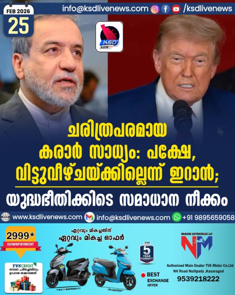 ജനീവ: ഇറാനും അമേരിക്കയും തമ്മിലുള്ള നിർണായകമായ മൂന്നാംവട്ട ആണവ ചർച്ചകൾ ഈ വ്യാഴാഴ്ച ജനീവയിൽ നടക്കാനിരിക്കേ, ഒരു ചരിത്രപരമായ കരാർ സാധ്യമാണെന്ന് ഇറാൻ വിദേശകാര്യ മന്ത്രി അബ്ബാസ് അരാഗ്ചി അറിയിച്ചു. പരസ്പര താല്പര്യങ്ങളും ആശങ്കകളും പരിഹരിക്കുന്ന ഒരു അഭൂതപൂർവമായ കരാറിനുള്ള ചരിത്രപരമായ അവസരമാണ് മുന്നിലുള്ളതെന്നും, നയതന്ത്രത്തിന് മുൻഗണന നൽകിയാൽ ഇത് യാഥാർഥ്യമാകുമെന്നും അദ്ദേഹം സാമൂഹിക മാധ്യമമായ എക്സിലൂടെ അറിയിച്ചു. ഇറാൻ ഒരിക്കലും ആണവായുധങ്ങൾ നിർമിക്കില്ലെന്നും എന്നാൽ സമാധാനപരമായ ആവശ്യങ്ങൾക്കായി ആണവ സാങ്കേതികവിദ്യ ഉപയോഗിക്കാനുള്ള അവകാശം തങ്ങൾക്കുണ്ടെന്നും അദ്ദേഹം കൂട്ടിച്ചേർത്തു.