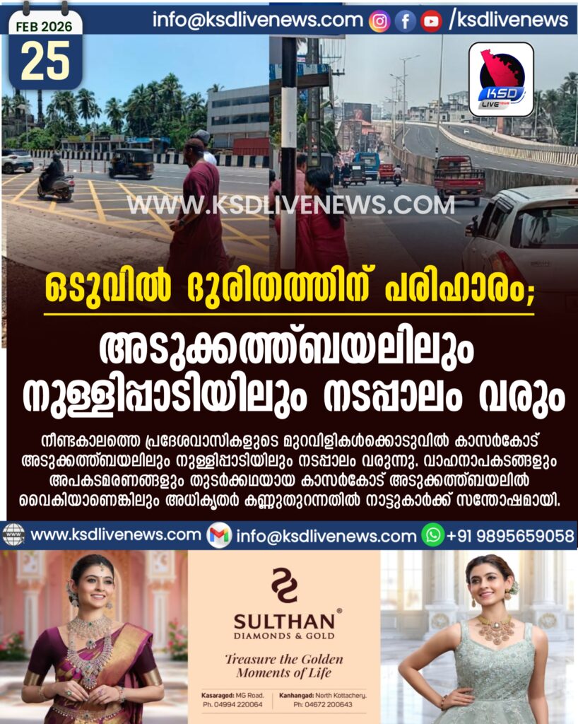 കാസർകോട്: നീണ്ടകാലത്തെ പ്രദേശവാസികളുടെ മുറവിളികൾക്കൊടുവിൽ കാസർകോട് അടുക്കത്ത്ബയലിലും നുള്ളിപ്പാടിയിലും നടപ്പാലം വരുന്നു. വാഹനാപകടങ്ങളും അപകടമരണങ്ങളും തുടർക്കഥയായ കാസർകോട് അടുക്കത്ത്ബയലിൽ വൈകിയാണെങ്കിലും അധികൃതർ കണ്ണുതുറന്നതിൽ നാട്ടുകാർക്ക് സന്തോഷമായി. നടപ്പാലം അനുവദിച്ചതായി കഴിഞ്ഞദിവസമാണ് അധികൃതരിൽനിന്ന് അറിയിപ്പുണ്ടായത്. അടുക്കത്ത്ബയലിൽ നടപ്പാലത്തിനായി നാട്ടുകാർ കേന്ദ്ര ഉപരിതല ഗതാഗതമന്ത്രി നിതിൻ ഗഡ്ഗരിയെ കണ്ടിരുന്നു. അടുക്കത്ത്ബയൽ സുബ്രഹ്മണ്യ ക്ഷേത്ര കമ്മിറ്റിയും മുഹ് യിദ്ദീൻ ജമാഅത്ത് കമ്മിറ്റിയും ചേർന്ന് ആക്ഷൻ കമ്മിറ്റി രൂപവത്കരിച്ചായിരുന്നു കേന്ദ്രമന്ത്രിയെ കണ്ടത്.