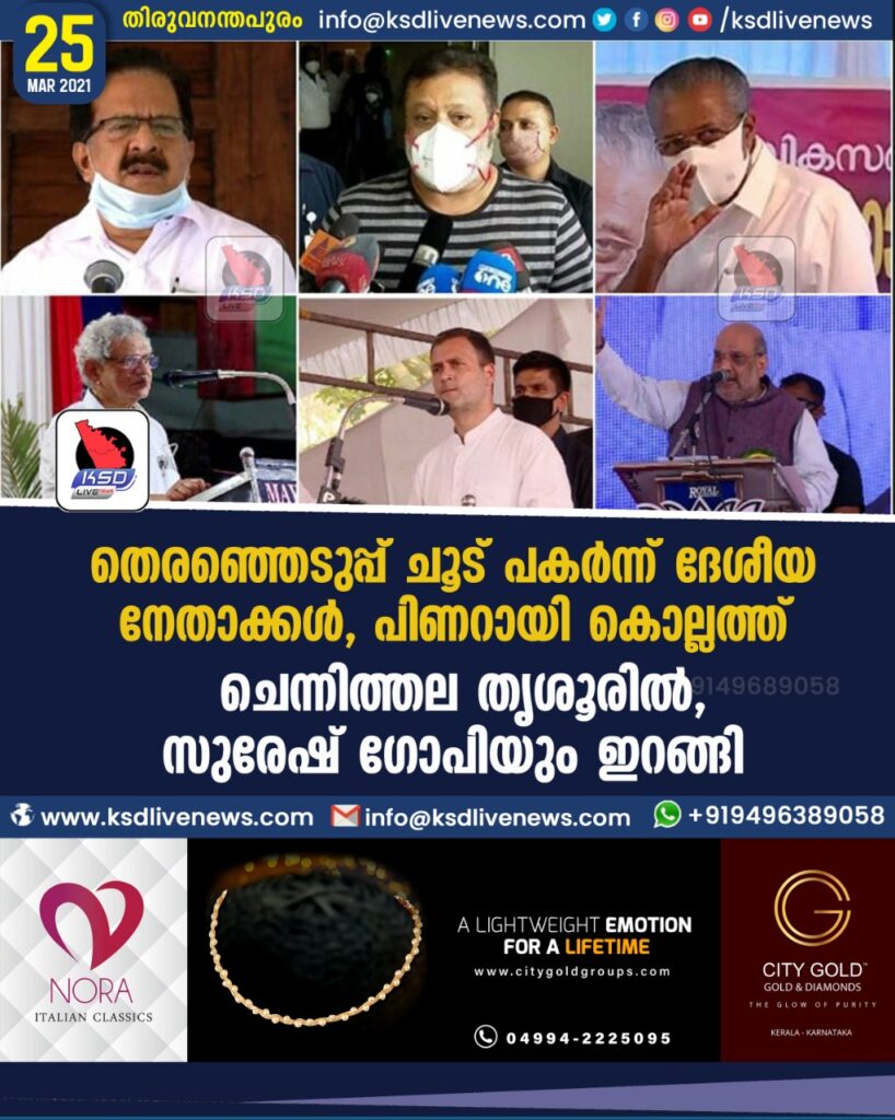 തെരഞ്ഞെടുപ്പ് ചൂട് പകർന്ന് ദേശീയ നേതാക്കൾ, പിണറായി കൊല്ലത്ത്, ചെന്നിത്തല തൃശൂരിൽ, സുരേഷ് ഗോപിയും ഇറങ്ങി