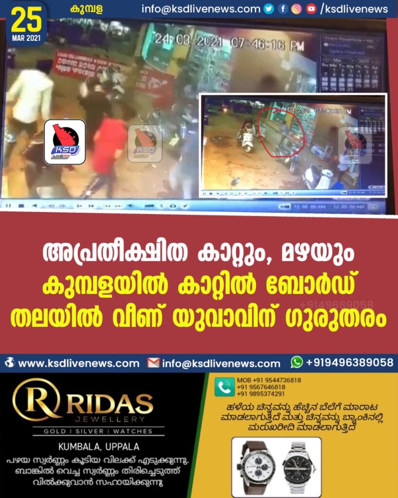 അപ്രതീക്ഷിത കാറ്റും, മഴയും, കുമ്പളയിൽ കാറ്റിൽ ബോർഡ് തലയിൽ വീണ് യുവാവിന് ഗുരുതരം