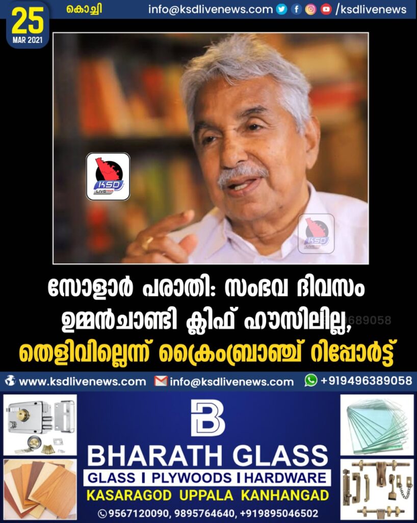 സോളാര് പരാതി: സംഭവ ദിവസം ഉമ്മൻ ചാണ്ടി ക്ലിഫ് ഹൗസിലില്ല, തെളിവില്ലെന്ന് ക്രൈംബ്രാഞ്ച് റിപ്പോര്ട്ട്