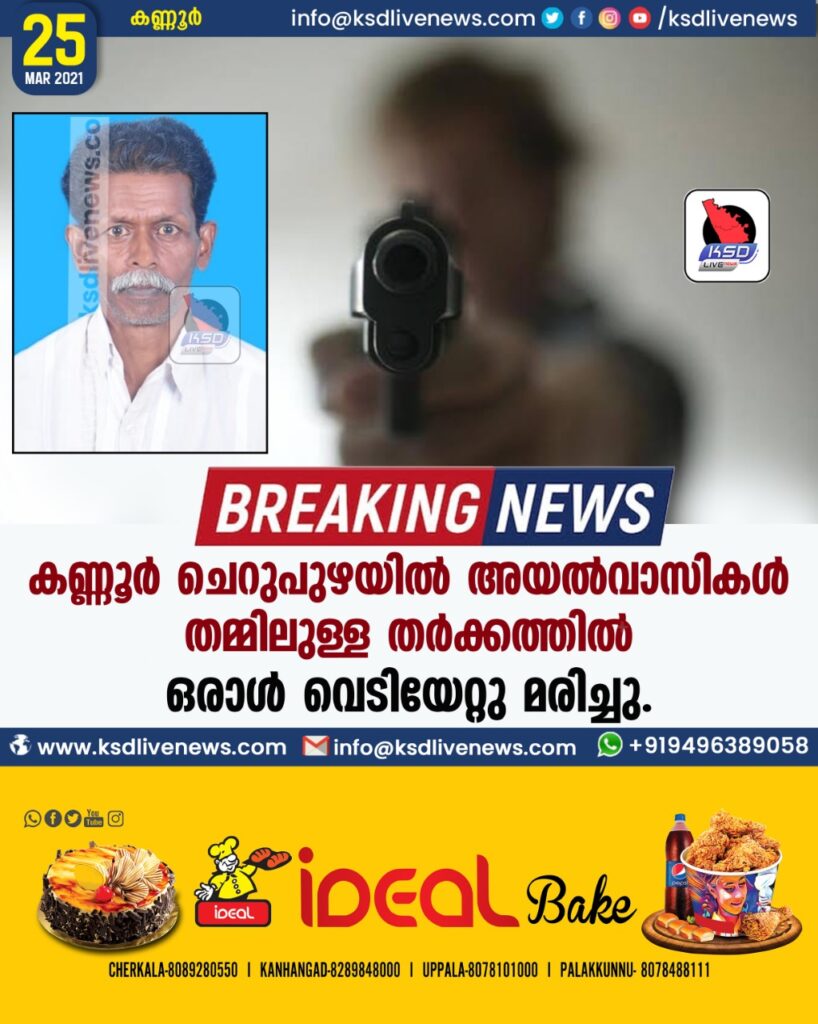 കണ്ണൂർ ചെറുപുഴയിൽ അയൽവാസികൾ തമ്മിലുള്ള തർക്കത്തിൽ ഒരാൾ വെടിയേറ്റു മരിച്ചു.