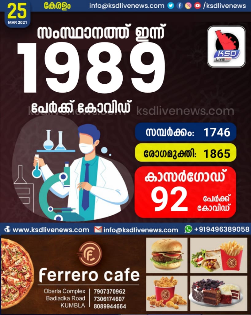 സംസ്ഥാനത്ത് ഇന്ന് 1984 പേർക്ക് കോവിഡ് സ്ഥിരീകരിച്ചു. സമ്പർക്കം വഴി 1745 പേർക്കും ; ആശ്വാസമായി 1865 പേർക്ക് രോഗ മുക്തിയും ; കാസർഗോഡ് ജില്ലയിൽ 92 പേർക്ക് പുതിയ കോവിഡ് കേസുകൾ ; മരണം 11