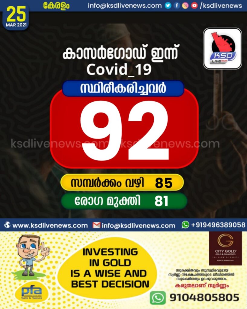 കാസർഗോഡ് ജില്ലയിൽ ഇന്ന് 92 പേർക്ക് കോവിഡ് സ്ഥിരീകരിച്ചു. സമ്പർക്കം വഴി 85 പേർക്കും. 81 പേർക്ക് രോഗമുക്തിSHARE THIS ONകാസർഗോഡ് ജില്ലയിൽ ഇന്ന് 92 പേർക്ക് കോവിഡ് സ്ഥിരീകരിച്ചു. സമ്പർക്കം വഴി 85 പേർക്കും. 81 പേർക്ക് രോഗമുക്തി