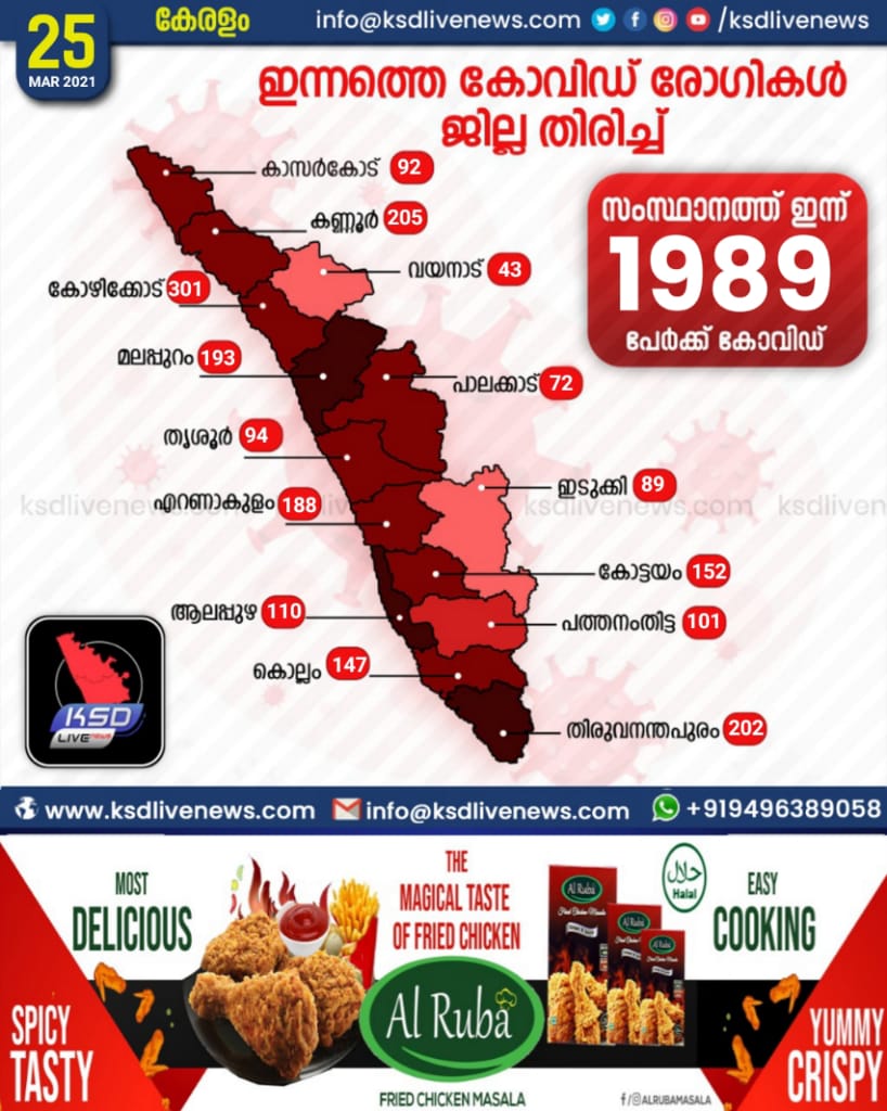 സംസ്ഥാനത്ത് ഇന്ന് 1989 പേര്‍ക്ക് കോവിഡ്-19 സ്ഥിരീകരിച്ചു. കോഴിക്കോട് 301, കണ്ണൂര്‍ 205, തിരുവനന്തപുരം 202, മലപ്പുറം 193, എറണാകുളം 188, കോട്ടയം 152, കൊല്ലം 147, ആലപ്പുഴ 110, പത്തനംതിട്ട 101, തൃശൂര്‍ 94, കാസര്‍ഗോഡ് 92, ഇടുക്കി 89, പാലക്കാട് 72, വയനാട് 43 എന്നിങ്ങനേയാണ് ജില്ലകളില്‍ ഇന്ന് രോഗ ബാധ സ്ഥിരീകരിച്ചത്.