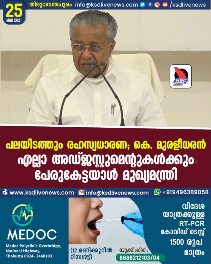 പലയിടത്തും രഹസ്യധാരണ; കെ. മുരളീധരന്‍ എല്ലാ അഡ്ജസ്റ്റുമെന്റുകള്‍ക്കും പേരുകേട്ടയാള്‍ – മുഖ്യമന്ത്രി