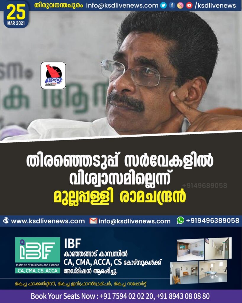 തിരഞ്ഞെടുപ്പ് സര്വേകളില് വിശ്വാസമില്ലെന്ന് മുല്ലപ്പള്ളി രാമചന്ദ്രന്