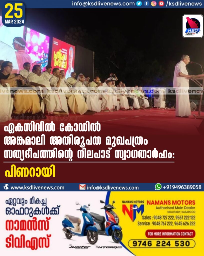 ഏകസിവില് കോഡിൽ അങ്കമാലി അതിരൂപത മുഖപത്രം ‘സത്യദീപ’ത്തിന്റെ നിലപാട് സ്വാഗതാര്ഹം- പിണറായി