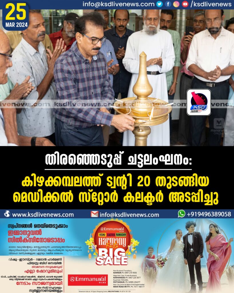 കൊച്ചി: ട്വന്റി 20 കിഴക്കമ്പലത്ത് ആരംഭിച്ച മെഡിക്കൽ സ്റ്റോർ ജില്ലാ തിരഞ്ഞെടുപ്പ് റിട്ടേണിങ് ഓഫീസർ കൂടിയായ കലക്ടർ അടപ്പിച്ചു. പ്രഥമദൃഷ്ട്യാ പെരുമാറ്റച്ചട്ട ലംഘനം കണ്ടെത്തിയെന്നു വ്യക്തമാക്കിയാണു കലക്ടറുടെ ഉത്തരവ്. ട്വന്റി 20 കൺവീനർ സാബു എം.ജേക്കബും പാർട്ടിയും തങ്ങളുടെ ഔദ്യോഗിക അക്കൗണ്ടുകളിൽ മെഡിക്കൽ സ്റ്റോർ ഉദ്ഘാടനം സംബന്ധിച്ച് പങ്കുവച്ചിട്ടുള്ള വിഡിയോ നീക്കം ചെയ്യാനും നിർദേശമുണ്ട്. ലോക്സഭാ തിരഞ്ഞെടുപ്പ് മാർച്ച് 16നു പ്രഖ്യാപിച്ചതോടെ പെരുമാറ്റച്ചട്ടം നിലവിൽ വന്നു. മാർച്ച് 21നാണു മെഡിക്കൽ സ്റ്റോർ ഉദ്ഘാടനം ചെയ്യുന്നത്. ഇവിടെ നിന്ന് 80% വിലക്കുറവിൽ മരുന്നുകൾ ലഭിക്കുമെന്നതു വോട്ടർമാരെ സ്വാധീനിക്കാനുള്ള നീക്കമാണെന്നു ചൂണ്ടിക്കാട്ടി സുധീർ സി.എസ്., അൽത്താഫ് എം.എം. എന്നിവരാണു പരാതി നൽകിയത്. ഇത്തരത്തിൽ വോട്ടർമാരെ പ്രലോഭിപ്പിക്കുന്ന വിധത്തിൽ സൗജന്യങ്ങളോ മറ്റ് വാഗ്ദാനങ്ങളോ നൽകി വോട്ടു പിടിക്കുന്നത് ജനപ്രാതിനിധ്യ നിയമത്തിന്റെ ലംഘനമാണ്. പരാതിയെ തുടർന്ന് റിട്ടേണിങ് ഓഫീസർ ഇരുഭാഗത്തിന്റെയും വിശദീകരണം കേട്ടിരുന്നു. തുടർന്ന് ഇക്കാര്യങ്ങൾ പരിശോധിച്ച ശേഷമാണ് മെഡിക്കൽ സ്റ്റോർ അടച്ചുപൂട്ടാൻ നിർദേശം നൽകിയത്. കിഴക്കമ്പലത്തു പ്രവർത്തിക്കുന്ന ഭക്ഷ്യസുരക്ഷാ മാർക്കറ്റിന്റെ ഭാഗമായുള്ളതാണു മെഡിക്കൽ സ്റ്റോർ എന്നും ട്വന്റി 20 പാർട്ടിയുമായി ഇതിന് ബന്ധമില്ല എന്നുമാണ് ട്വന്റി 20 പ്രതിനിധികൾ വാദിച്ചത്. എന്നാൽ ഭക്ഷ്യസുരക്ഷാ മാർക്കറ്റ് പ്രവർത്തിക്കുന്നത് കിറ്റക്സ് ചിൽഡ്രൻസ്വിയർ ലിമിറ്റഡിന്റെ സിഎസ്ആർ ഫണ്ട് ഉപയോഗിച്ചും ട്വന്റി 20 അസോസിയേഷന്റെ പിന്തുണയോടെയുമാണ്. രാഷ്ട്രീയ പാർട്ടിയായ ട്വന്റി 20 യുടെയും ട്വന്റി 20 അസോസിയേഷന്റെയും ഭാരവാഹികൾ ഒരേ ആൾക്കാരാണ്. മാത്രമല്ല, രാഷ്ട്രീയ പാർട്ടിയായ ട്വന്റി 20, ഭക്ഷ്യസുരക്ഷാ മാർക്കറ്റ്, ട്വന്റി 20 അസോസിയേഷൻ എന്നീ മൂന്നിന്റെയും ലോഗോ ഒന്നു തന്നെയാണ്. ഒരു സ്വകാര്യ കമ്പനിയും ഒരു റജിസ്ട്രേഡ് അസോസിയേഷനും ഒരു രാഷ്ട്രീയ പാർട്ടിയും ഒരേ ലോഗോയും ഒരേ ഭാരവാഹികളും പങ്കുവയ്ക്കുന്നു എന്ന പ്രത്യേകതയുള്ള സംഭവമാണ് ഇതിലുള്ളത്. ഈ സാഹചര്യത്തെക്കുറിച്ച് കേന്ദ്ര തിരഞ്ഞെടുപ്പ് കമ്മീഷനിൽ നിന്ന് വ്യക്തത തേടിയിട്ടുണ്ട്. അതുവരെ, പെരുമാറ്റച്ചട്ടം നിലവിൽ വന്ന ശേഷം ആരംഭിച്ച മെഡിക്കൽ സ്റ്റോറിന്റെ പ്രവർത്തനം നിർത്തിവയ്ക്കാനാണു നിർദേശം നൽകിയിരിക്കുന്നത്. മാത്രമല്ല, മെഡിക്കൽ സ്റ്റോർ ഉദ്ഘാടനം ചെയ്തുകൊണ്ട് കിറ്റക്സ് എംഡി സാബു എം.ജേക്കബ് നടത്തിയ പ്രസംഗവും ഉത്തരവിൽ പരാമർശവിധേയമായി. ട്വന്റി 20 തിരഞ്ഞെടുക്കപ്പെട്ടാൽ കേരളത്തിലെ 941 പഞ്ചായത്തുകളിലും 87 മുനിസിപ്പാലിറ്റികളിലും 6 കോർപ്പറേഷനുകളിലും 50 ശത