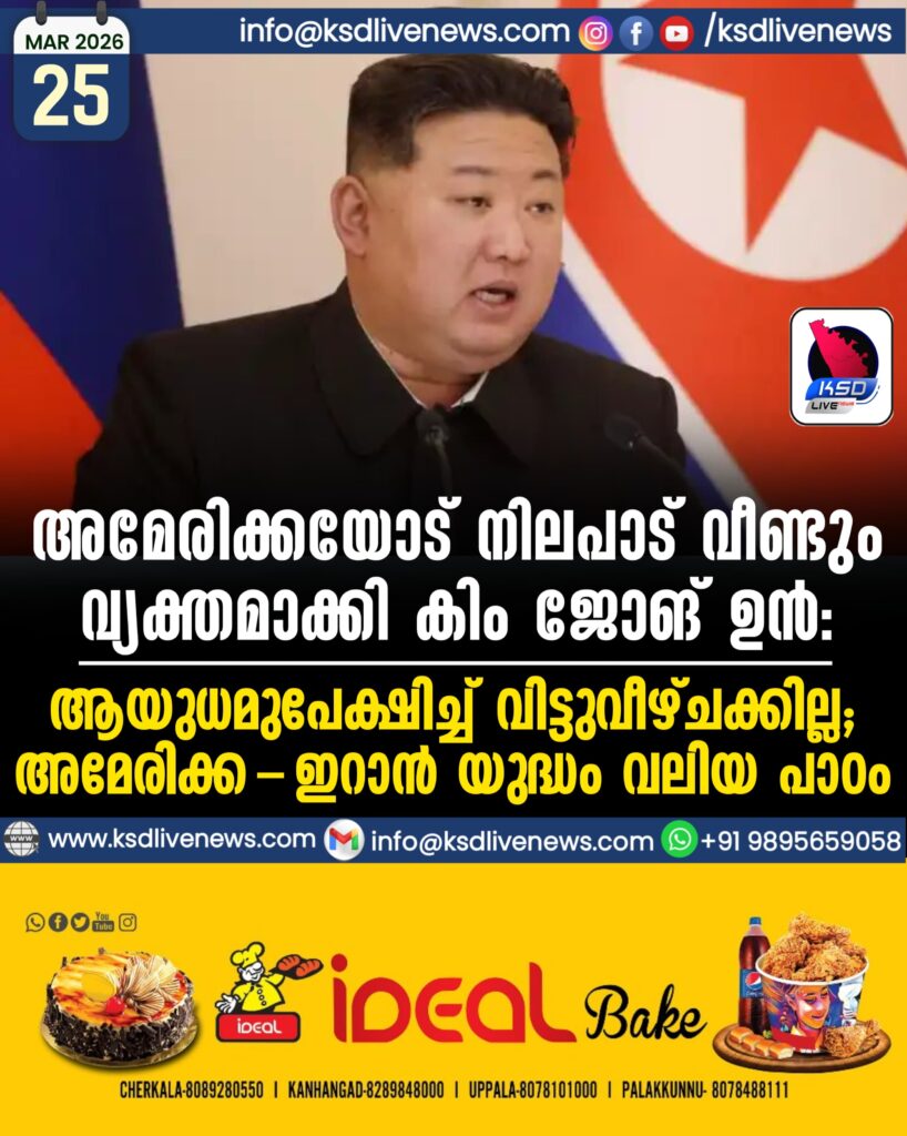 അമേരിക്കയോട് നിലപാട് വീണ്ടും വ്യക്തമാക്കി കിം ജോങ് ഉൻ: ആയുധമുപേക്ഷിച്ച് വിട്ടുവീഴ്ചക്കില്ല; അമേരിക്ക-ഇറാൻ യുദ്ധം വലിയ പാഠം