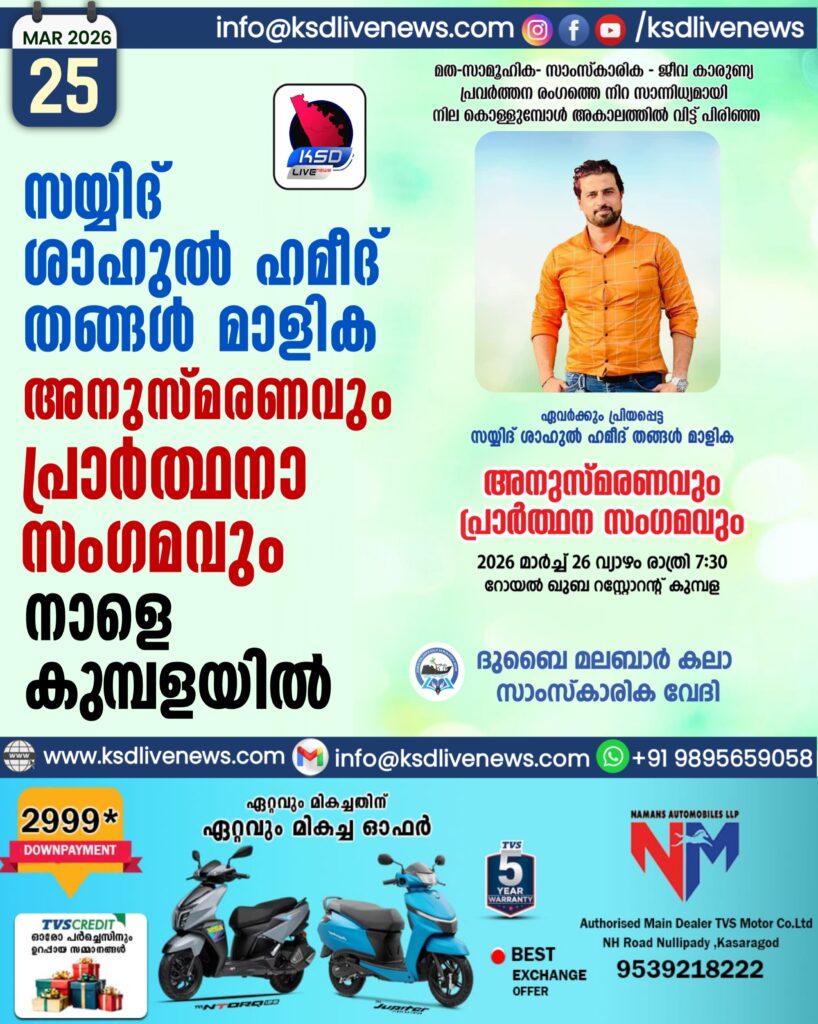 കുമ്പള: മത-സാമൂഹിക-സാംസ്കാരിക-ജീവകാരുണ്യ രംഗത്തെ നിറസാന്നിധ്യമായിരുന്ന സയ്യിദ് ശാഹുൽ ഹമീദ് തങ്ങൾ മാളികയുടെ വിയോഗത്തിൽ ദുബൈ മലബാർ കലാ സാംസ്കാരിക വേദി സംഘടിപ്പിക്കുന്ന അനുസ്മരണവും പ്രാർത്ഥനാ സംഗമവും നാളെ (മാർച്ച് 26, വ്യാഴം) നടക്കും.