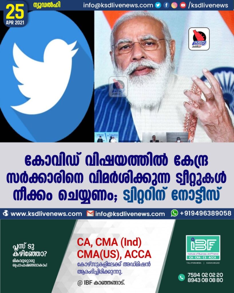 കോവിഡ് വിഷയത്തിൽ കേന്ദ്രസർക്കാരിനെ വിമര്‍ശിക്കുന്ന ട്വീറ്റുകള്‍ നീക്കം ചെയ്യണം; ട്വിറ്ററിന് നോട്ടീസ്