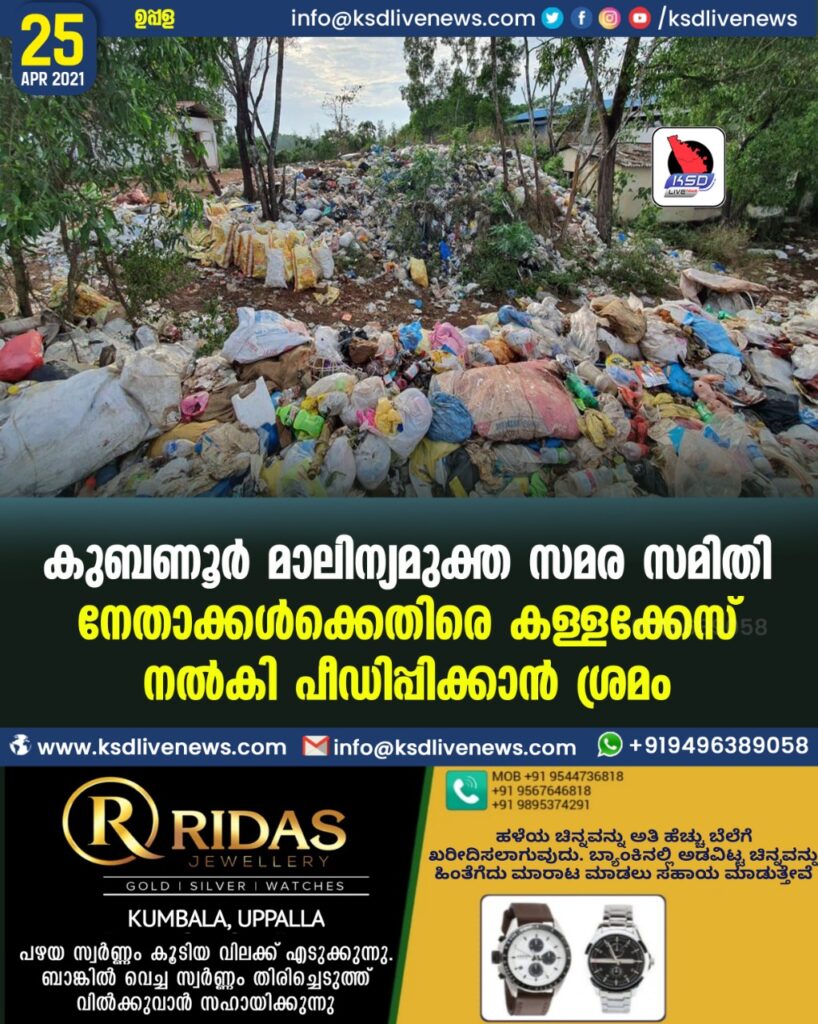 ഉപ്പള : മംഗല്പാടി പഞ്ചായത് വക കുബണുർ മാലിന്യ സംസ്കരണ ശാലയിൽ 14 വര്ഷങ്ങളായി മാലിന്യങ്ങൾ സാംസ്ക്കരിക്കാതെ കൂട്ടിട്ടിയിട്ട് കുപ്രസിദ്ധമായ “മാലിന്യമല” സൃഷ്ടിക്കപ്പെട്ടതിന്നെതിരെ പ്രദേശവാസികളുടെ നേതൃത്വത്തിൽ മാലിന്യ മുക്ത സമരസമിതി രൂപീകരിച്ചു പഞ്ചായത്തിന്നെത്തിരെ സമരം നടത്തിയതിന്റെ വിരോധത്തിൽ നാട്ടുകാരായ സമരസമിതി നേതാക്കൾക്കെതിരെ പഞ്ചായത്ത് പ്രസിഡന്റ് സെക്രട്ടറി യെക്കൊണ്ട് പോലീസിൽ പരാതി നൽകി കള്ളക്കേസിൽ കുടുക്കാൻ ശ്രമം