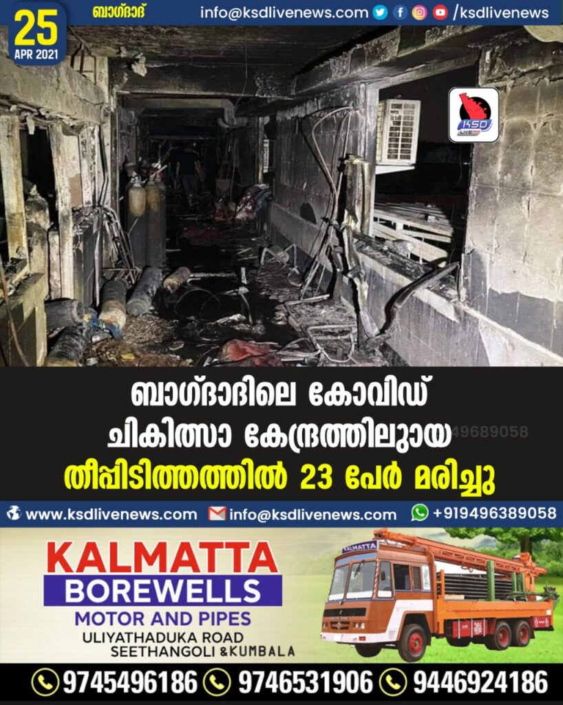ബാഗ്ദാദിലെ കോവിഡ് ചികിത്സാകേന്ദ്രത്തിലുണ്ടായ തീപ്പിടിത്തത്തില് 23 പേര് മരിച്ചു