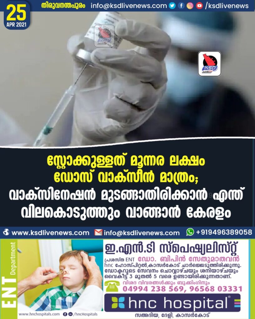 സ്റ്റോക്കുള്ളത് മൂന്നര ലക്ഷം ഡോസ് വാക്സീൻ മാത്രം; വാക്സിനേഷൻ മുടങ്ങാതിരിക്കാൻ എന്ത് വിലകൊടുത്തും വാങ്ങാൻ കേരളം