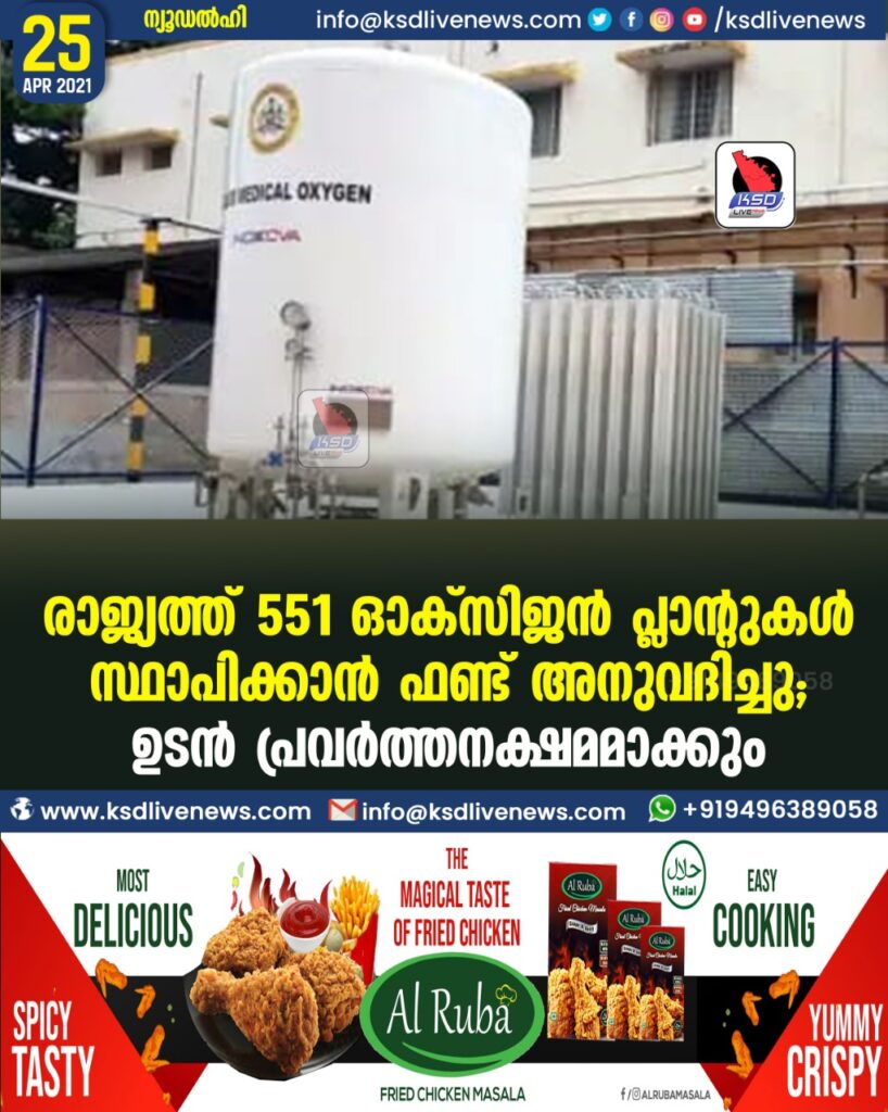 രാജ്യത്ത് 551 ഓക്സിജന് പ്ലാന്റുകള് സ്ഥാപിക്കാന് ഫണ്ട് അനുവദിച്ചു; ഉടൻ പ്രവർത്തനക്ഷമമാക്കും