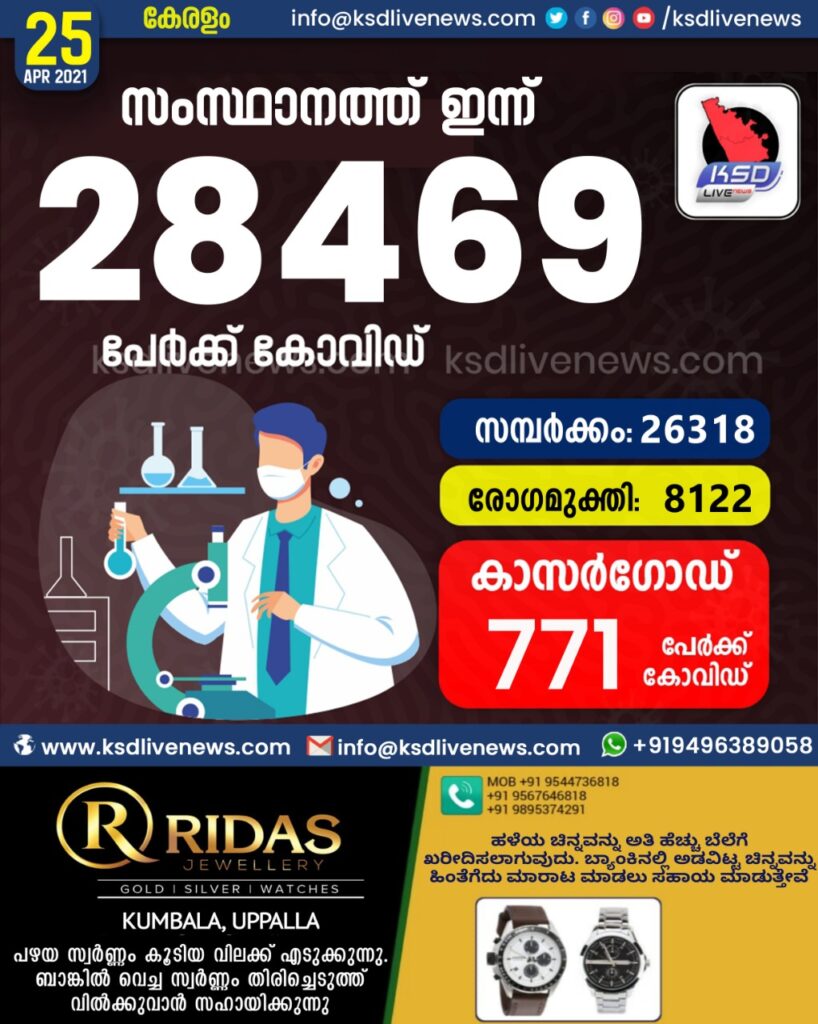 കോവിഡിൽ വിറച്ച് കേരളം ; സംസ്ഥാനത്ത് ഇന്ന് 28469 പേർക്ക് കോവിഡ് സ്ഥിരീകരിച്ചു. സമ്പർക്കം വഴി 26318 പേർക്കും ; ആശ്വാസമായി 8122 പേർക്ക് രോഗ മുക്തിയും ; കാസർഗോഡ് ജില്ലയിൽ 771 പേർക്ക് പുതിയ കോവിഡ് കേസുകൾ ; മരണം 30