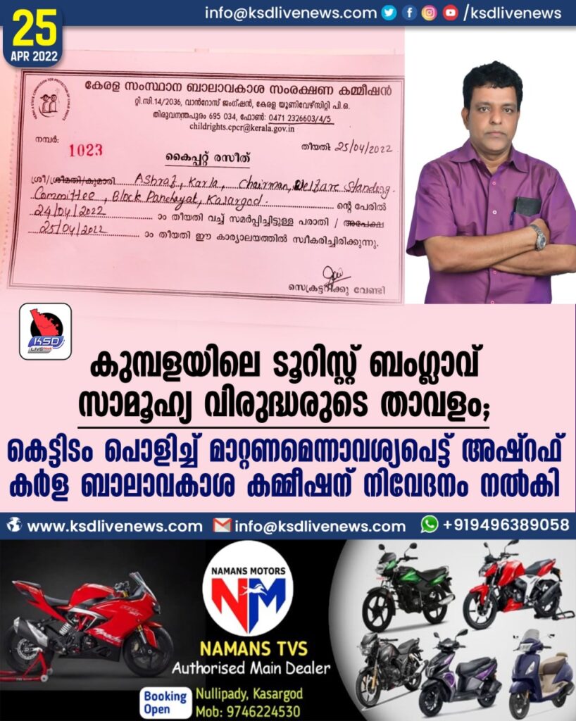 കുമ്പള : 1954 ലെ കാമരാജ് സർക്കാരിൻ്റെ കാലത്ത് പൊതുമരാമത്ത് വകുപ്പിന് കീഴിൽ കുമ്പളയിൽ നിർമിച്ച ടൂറിസ്റ്റ് ബംഗ്ലാവ്( ടി.ബി) നിലവിൽ തിരിഞ്ഞു നോക്കാൻ ആളില്ലാതെ സാമൂഹ്യ വിരുദ്ധർ താവളമാക്കിയതോടെ കെട്ടിടം പൊളിച്ച് മാറ്റുകയോ മറ്റേതെങ്കിലും സർക്കാർ സ്ഥാപനം പ്രവർത്തിക്കുന്നതിനോ മറ്റോ നടപടി സ്വീകരിക്കണമെന്ന് കാസർകോട് ബ്ലോക്ക് പഞ്ചായത്ത് സ്ഥിരം സമിതി അധ്യക്ഷൻ അഷ്റഫ് കർള സംസ്ഥാന ബാലാവകാശ കമ്മീഷന് നൽകിയ നിവേദനത്തിൽ ആവശ്യപ്പെട്ടു.