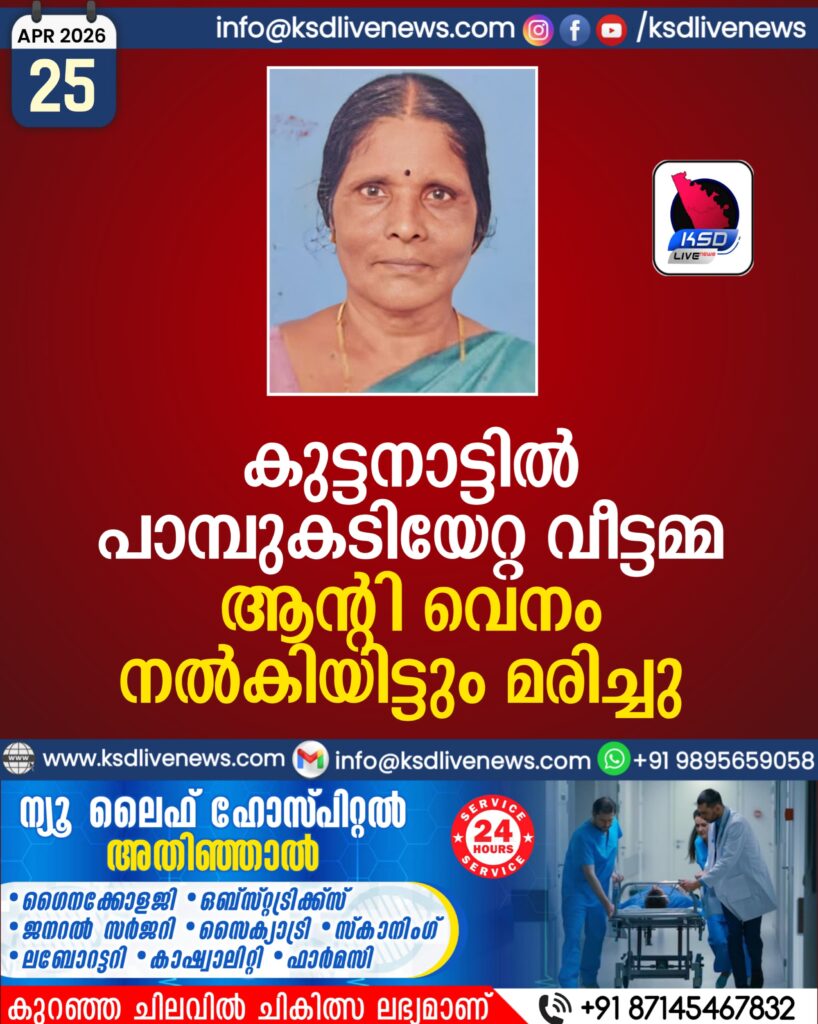 കുട്ടനാട്ടില് പാമ്പുകടിയേറ്റ വീട്ടമ്മ ആന്റി വെനം നല്കിയിട്ടും മരിച്ചു