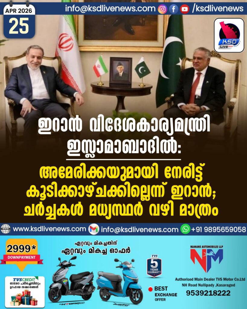 ഇറാൻ വിദേശകാര്യമന്ത്രി ഇസ്ലാമാബാദില്, അമേരിക്കയുമായി നേരിട്ട് കൂടിക്കാഴ്ചക്കില്ലെന്ന് ഇറാൻ, ചർച്ചകൾ മധ്യസ്ഥർ വഴി മാത്രം
