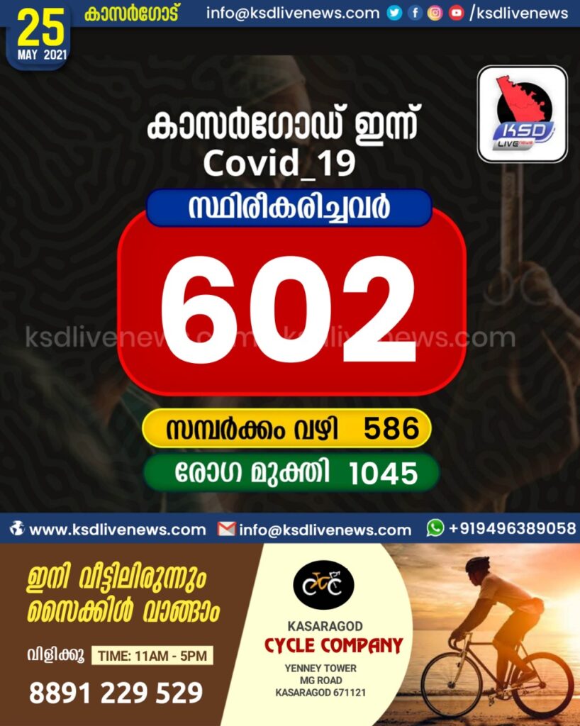 കാസർഗോഡ് ജില്ലയിൽ ഇന്ന് 602 പേർക്ക് കോവിഡ് സ്ഥിരീകരിച്ചു. സമ്പർക്കം വഴി 586 പേർക്കും. 1045 പേർക്ക് രോഗമുക്തിSHARE THIS ONകാസർഗോഡ് ജില്ലയിൽ ഇന്ന് 602 പേർക്ക് കോവിഡ് സ്ഥിരീകരിച്ചു. സമ്പർക്കം വഴി 586 പേർക്കും. 1045 പേർക്ക് രോഗമുക്തി