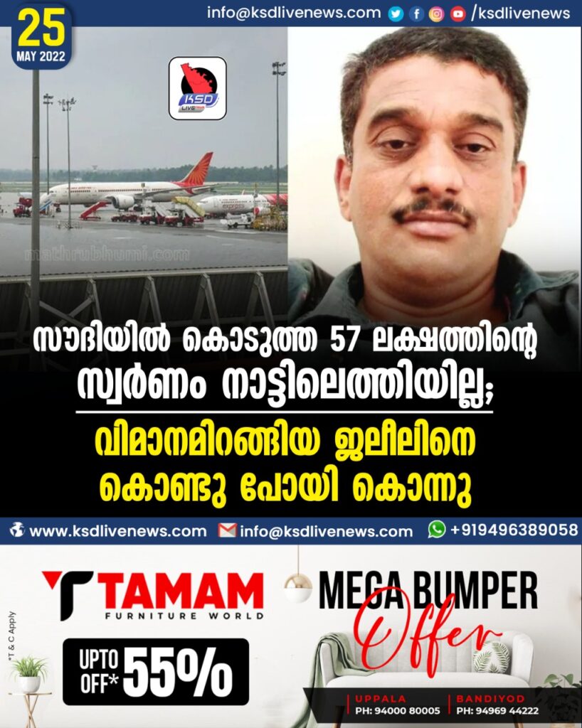 സൗദിയില് കൊടുത്ത 57 ലക്ഷത്തിന്റെ സ്വര്ണം നാട്ടിലെത്തിയില്ല; വിമാനമിറങ്ങിയ ജലീലിനെ കൊണ്ടുപോയി കൊന്നു