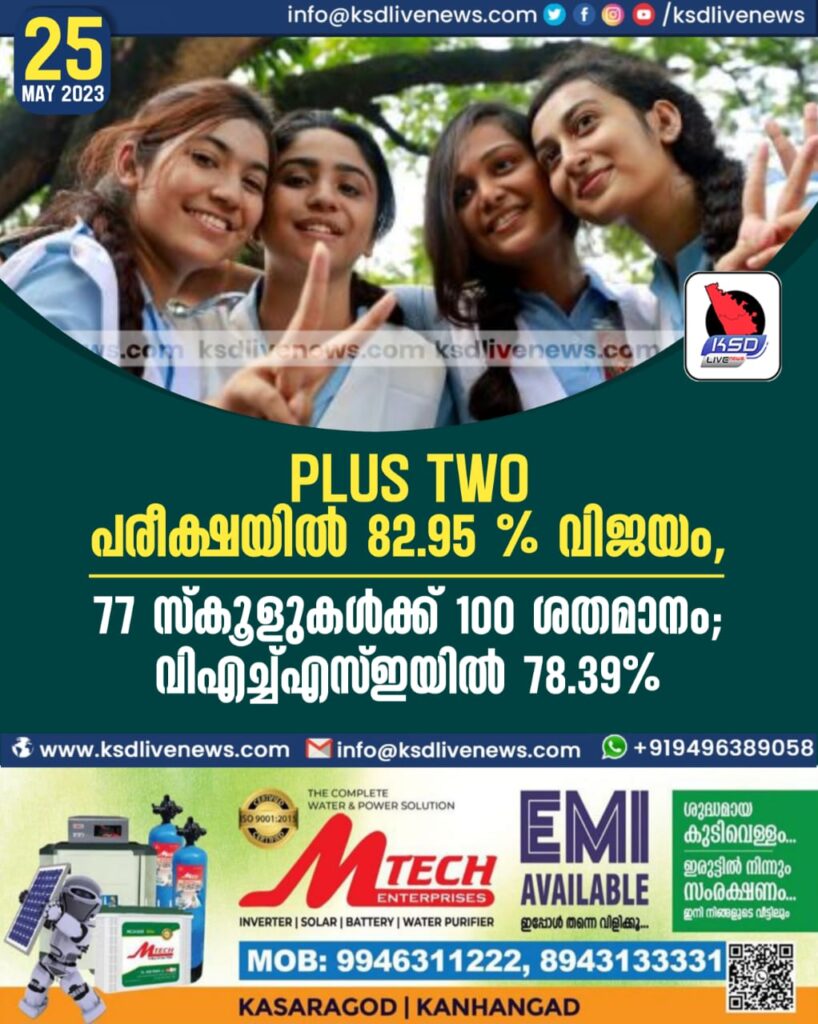 പ്ലസ് ടു പരീക്ഷയിൽ 82.95 % വിജയം, 77 സ്കൂളുകൾ‌ക്ക് 100 ശതമാനം; വിഎച്ച്എസ്‍ഇയിൽ 78.39%