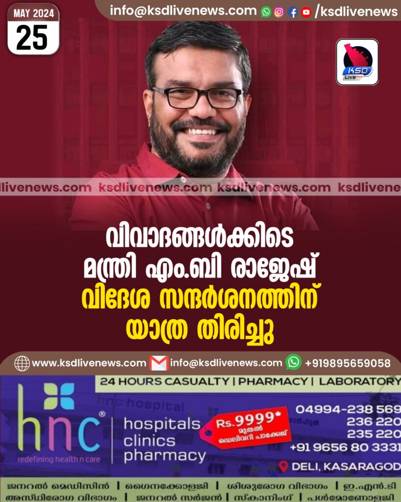 വിവാദങ്ങൾക്കിടെ മന്ത്രി എം.ബി രാജേഷ് വിദേശ സന്ദർശനത്തിന് യാത്ര തിരിച്ചു
