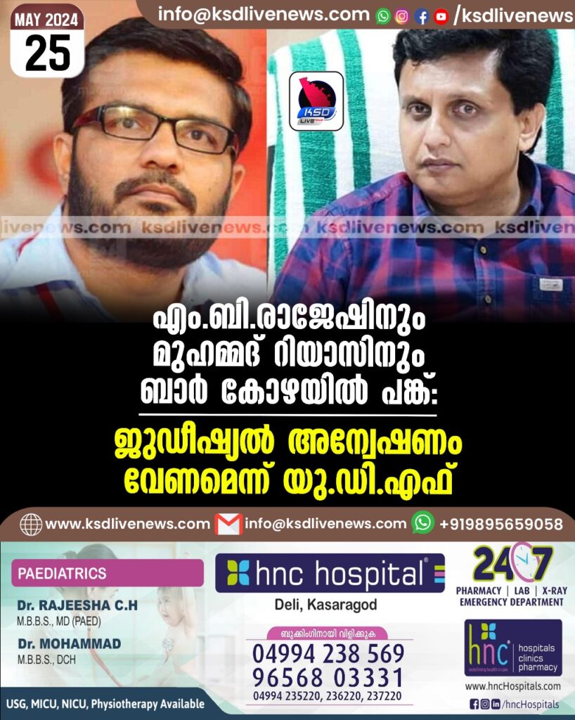 എം.ബി.രാജേഷിനും മുഹമ്മദ് റിയാസിനും ബാർ കോഴയിൽ പങ്ക്’: ജുഡീഷ്യൽ അന്വേഷണം വേണമെന്ന് യുഡിഎഫ്