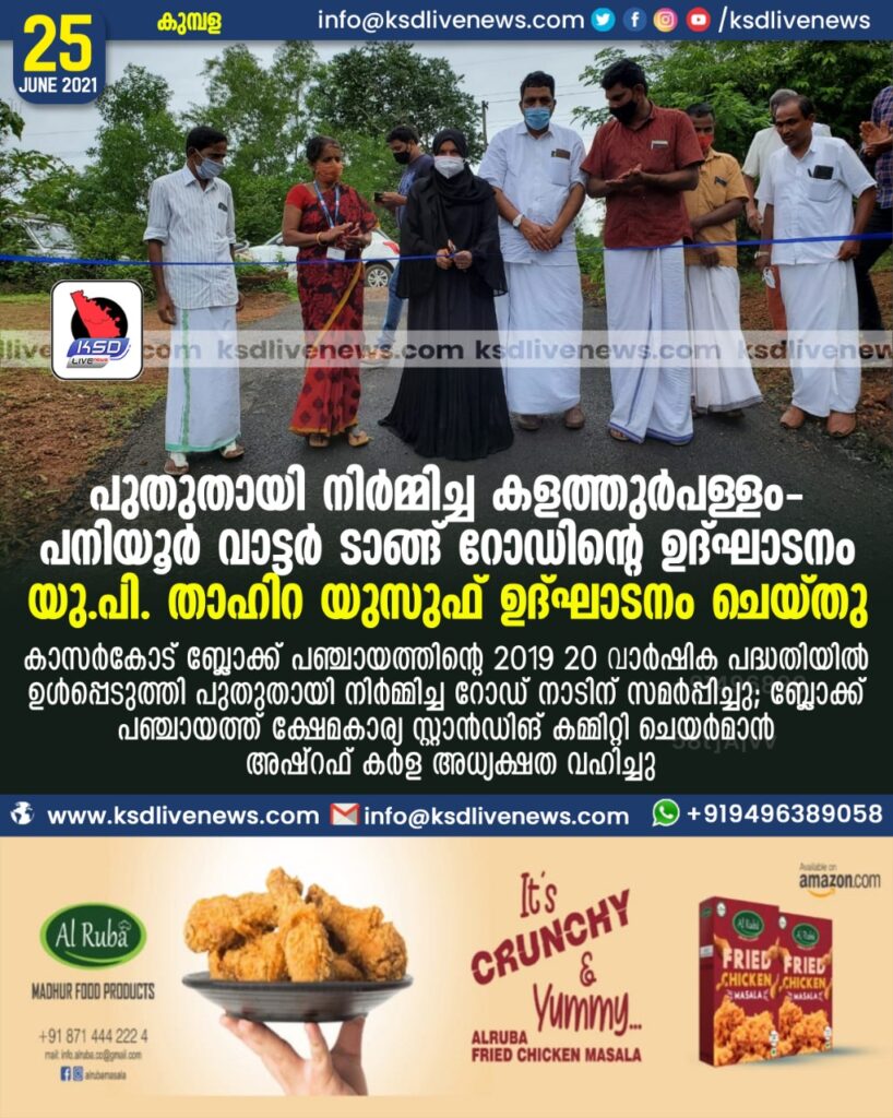 കുമ്പള..കാസർകോട് ബ്ലോക്ക് പഞ്ചായത്തിന്റെ 2019 20 വാർഷിക പദ്ധതിയിൽ ഉൾപ്പെടുത്തി പുതുതായി നിർമ്മിച്ച കളത്തുർപള്ളം പനിയൂർ വാട്ടർ ടാങ്ങ് റോഡിന്റെ ഉത്കാടനം ഉത്സവ അന്തരീക്ഷത്തിൽ കൊവിഡ് പ്രോട്ടോകോൾ മാനിച്ചു കുമ്പള ഗ്രാമപഞ്ചായത്ത് പ്രസിഡണ്ട് യു. പി. താഹിറ യുസഫ് ഉദ്ഘാടനം ചെയ്തു ബ്ലോക്ക് പഞ്ചായത്ത് ക്ഷേമകാര്യ സ്റ്റാൻഡിങ് കമ്മിറ്റി ചെയർമാൻ അഷ്റഫ് കർള അധ്യക്ഷത വഹിച്ചു വാർഡ് മെമ്പർ പുഷ്പലത ഷെട്ടി സ്വാഗതംപറഞ്ഞു മുൻ മെമ്പർ സുകേഷ് ബണ്ടാരി കെ വി യൂസഫ് .മഹേശ്. അബ്ദുല്ല കളത്തുർ എന്നിവർ പങ്കെടുടുത്തു ഏകദേശം 5 ലക്ഷം രൂപചിലവഴിച്ചു നിർമിച്ചതാണ് റോഡ്