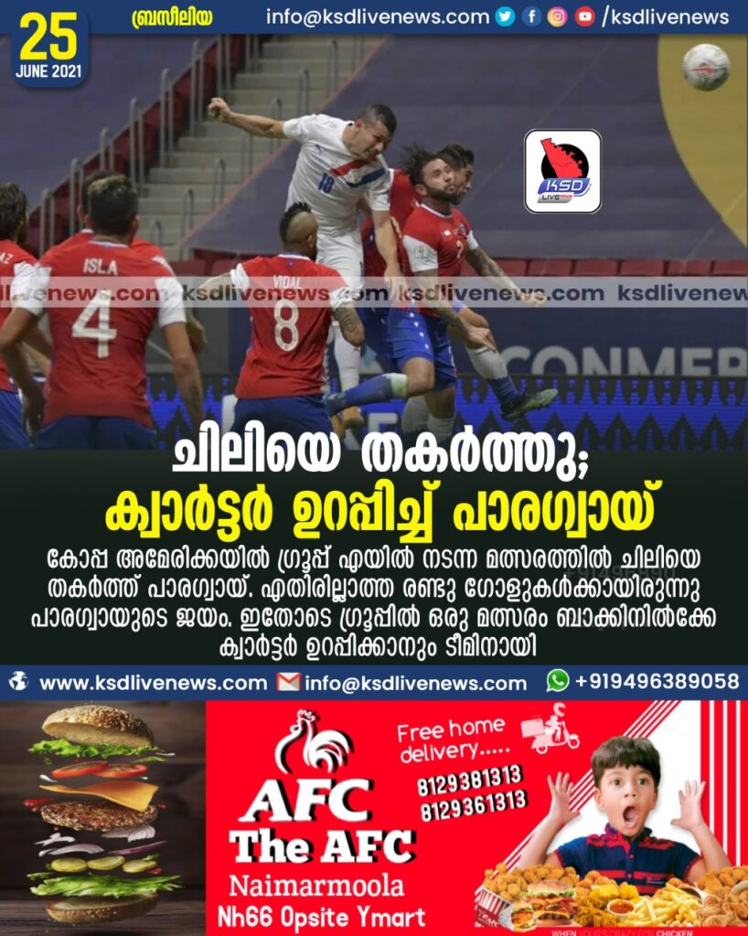 ചിലിയെ തകര്ത്തു; ക്വാര്ട്ടര് ഉറപ്പിച്ച് പാരഗ്വായ്