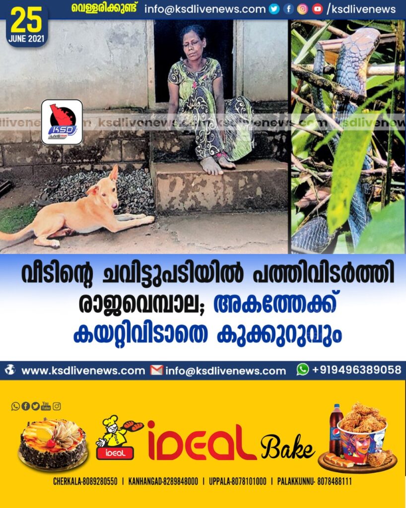 വീടിന്റെ ചവിട്ടുപടിയിൽ പത്തിവിടർത്തി രാജവെമ്പാല; അകത്തേക്ക് കയറ്റിവിടാതെ കുക്കുറുവും