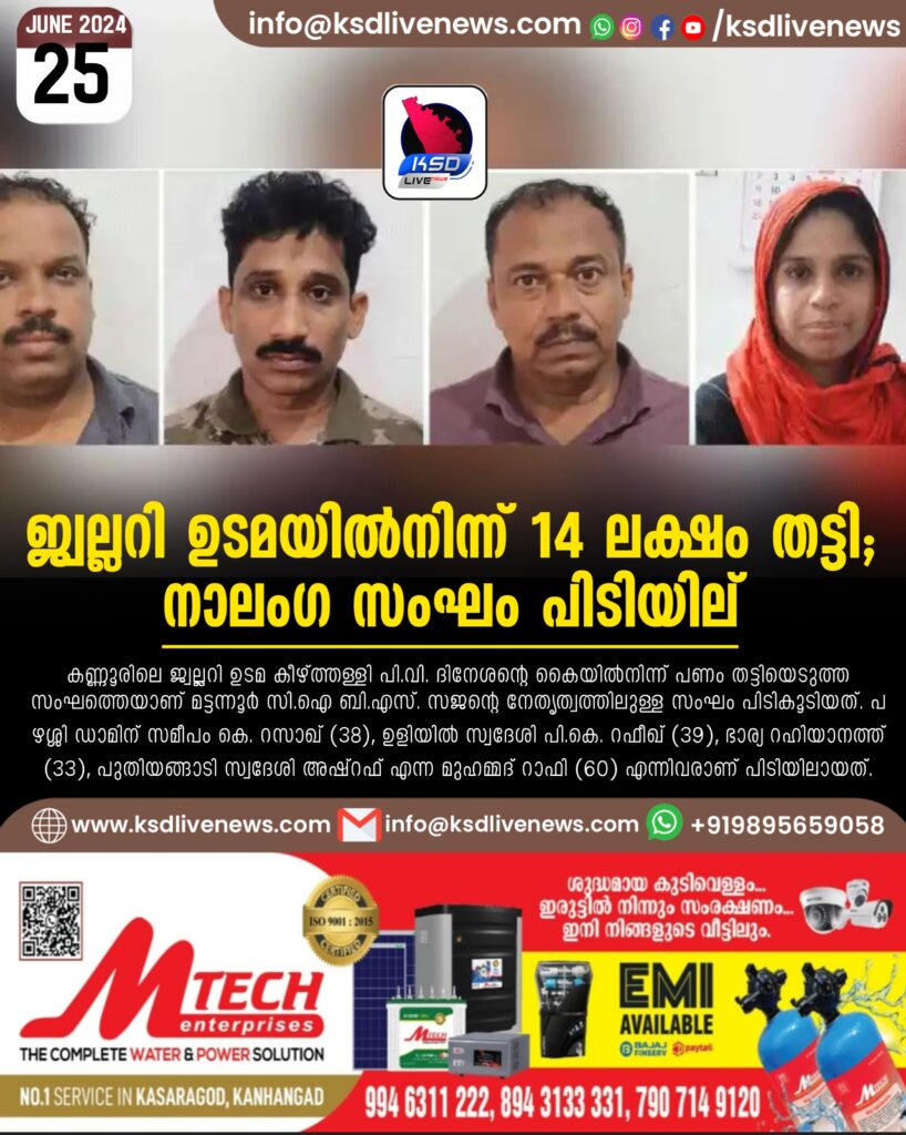 ജ്വല്ലറി ഉടമയില്നിന്ന് 14 ലക്ഷം തട്ടി; നാലംഗ സംഘം പിടിയില്