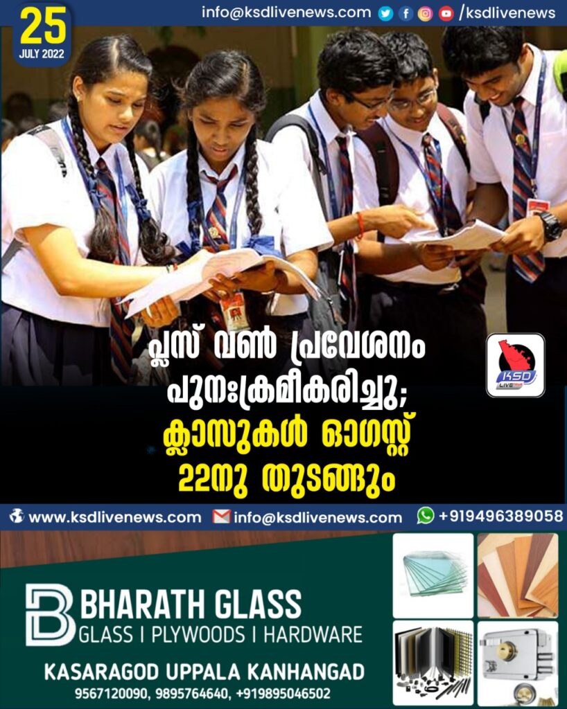 പ്ലസ് വണ് പ്രവേശനം പുനഃക്രമീകരിച്ചു; ക്ലാസുകള് ഓഗസ്റ്റ് 22നു തുടങ്ങും