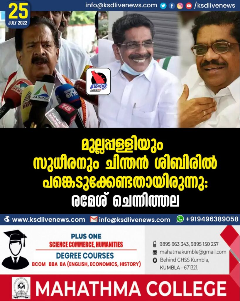 മുല്ലപ്പള്ളിയും സുധീരനും ചിന്തന് ശിബിരില് പങ്കെടുക്കേണ്ടതായിരുന്നു: രമേശ് ചെന്നിത്തല