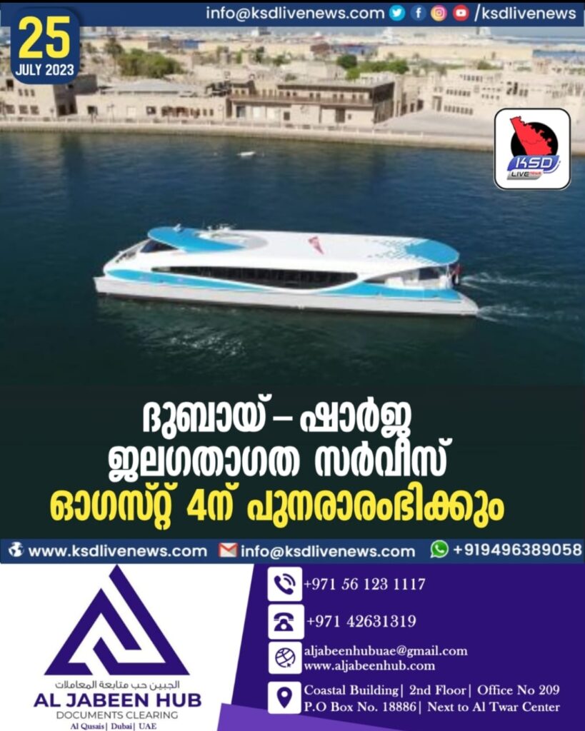 ദുബായ് ∙ ദുബായ്–ഷാർജ ജലഗതാഗത സർവീസുകൾ ഒാഗസ്റ്റ് 4ന് പുനരാരംഭിക്കുമെന്ന് ദുബായ് റോഡ്‌സ് ആൻഡ് ട്രാൻസ്‌പോർട്ട് അതോറിറ്റി(ആർടിഎ) അറിയിച്ചു. ദുബായ് ഫെറി വഴിയുള്ള സമുദ്ര ഗതാഗത ലെയ്നിന്റെ പ്രവർത്തനമാണ് വീണ്ടും ആരംഭിക്കുന്നത്.