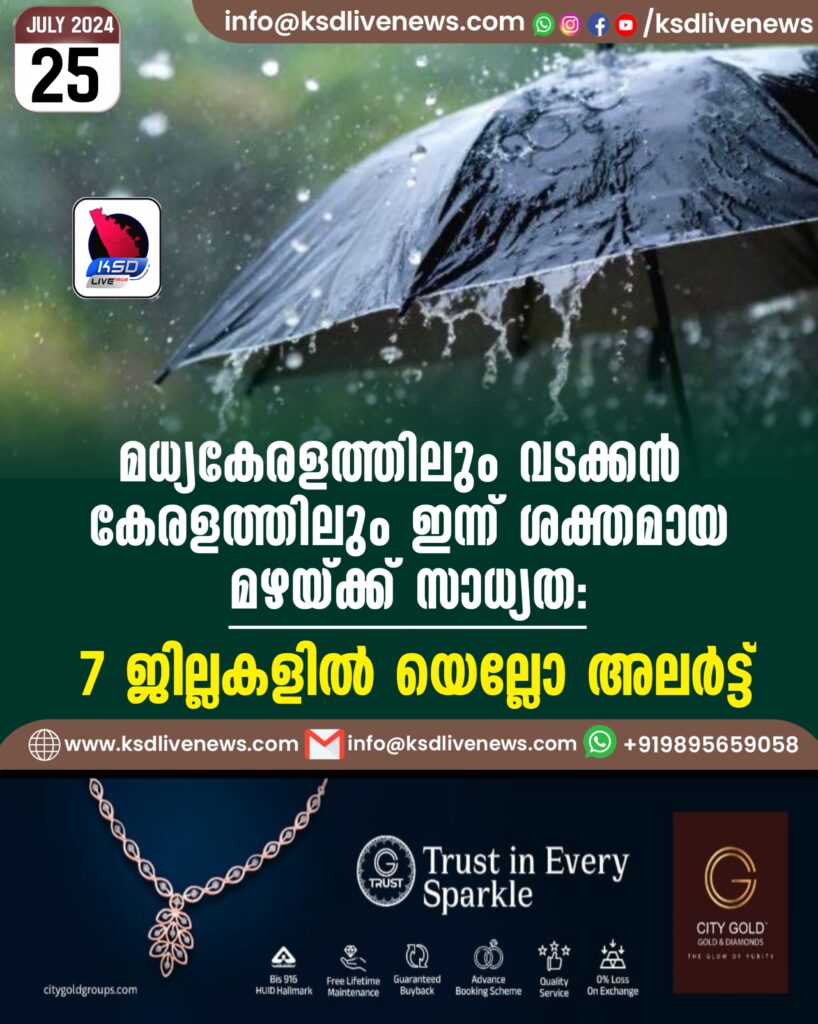 മധ്യകേരളത്തിലും വടക്കൻ കേരളത്തിലും ഇന്ന് ശക്തമായ മഴയ്ക്ക് സാധ്യത: 7 ജില്ലകളിൽ യെല്ലോ അലർട്ട്